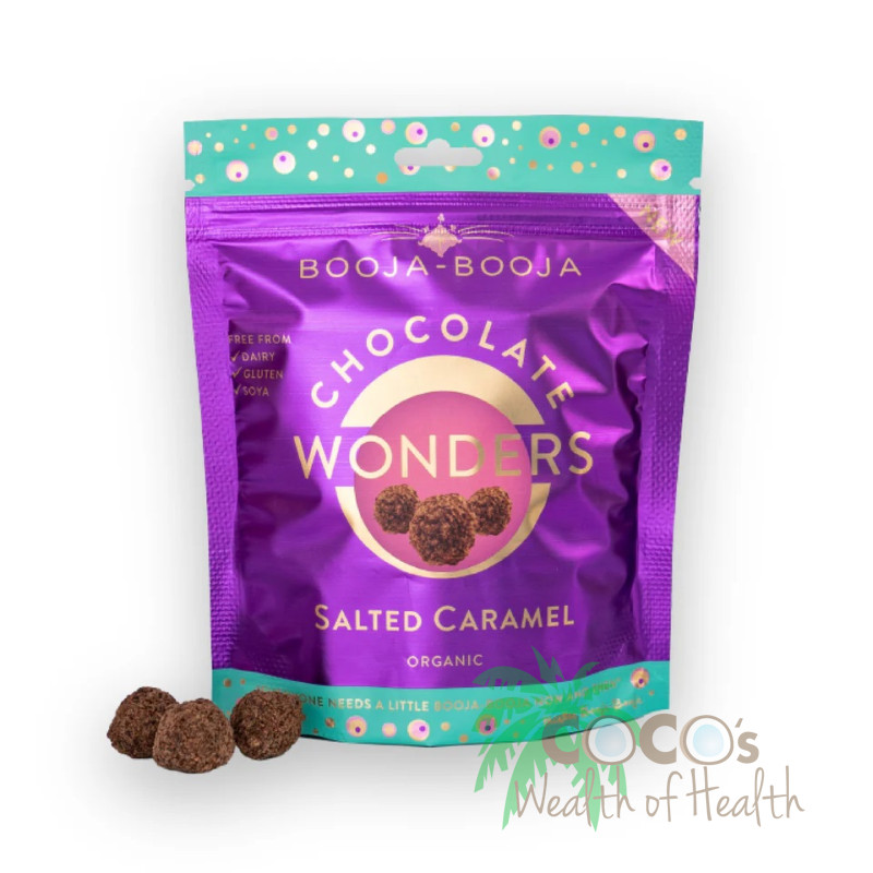 Amazingly delicious little chocolate adventures. Chocolate salted caramel chewy gooey ganache rolled in rich chocolate flakes. Like all Booja-Booja Chocolate Wonders, these irresistible bite-sized treats are dairy free, gluten free and vegan.