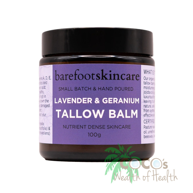 Ingredients: Certified Organic Beef Tallow (Australia), Certified Organic Unrefined Shea Butter (Ghana), Certified Organic Cold Pressed Jojoba Oil (Panama), Certified Organic Unrefined Beeswax (Australia), Therapeutic Lavender Essential Oil (USA or France), Therapeutic Geranium Essential Oil (Africa or Madagascar).