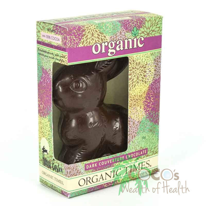 55% dark chocolate Easter bunny is decadent, smooth and truly delicious! Certified organic, fair trade, vegan friendly (no dairy), gluten free, palm oil free and with no GMOs. Made in Australia, using the finest organic & fair-trade ingredients.