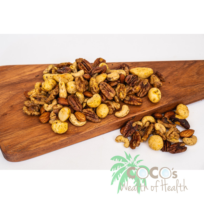 Wildfire Roast Mix is a bold, savoury & slightly spicey blend. This mouthwatering mix combines roast activated nuts, including Macadamia, Pecan, Walnuts, Almonds, Cashew & Brazil nuts - with pine needles, seaweed, thyme, sage, and various other spices for a truly wild flavor experience. Ignite your taste buds with every bite. Perfect for snacking on the go or as a nutritious addition to meals. With its unique blend of herbs and spices, Wildfire Roast Mix is a game-changer for health-conscious foodies.